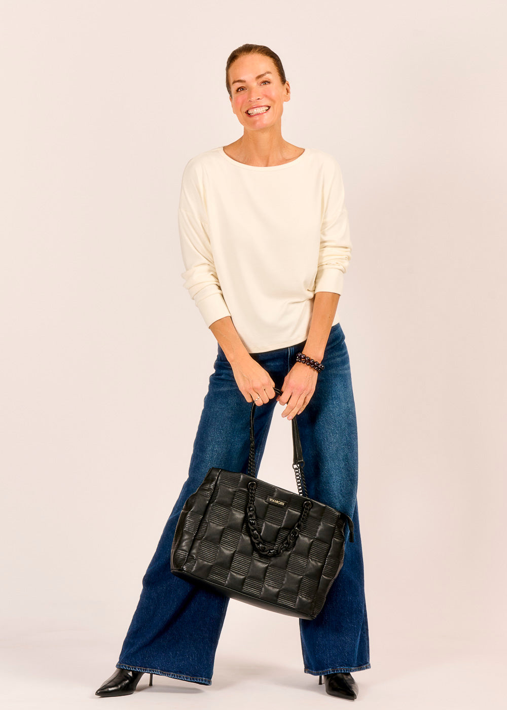 Markantes Statement: Diese schwarze Tasche besticht durch ihr einzigartiges Design und wird zum unverwechselbaren Highlight jedes Outfits. Durchdachte Details, Funktionalität und Ästhetik werden hier mühelos verbunden.