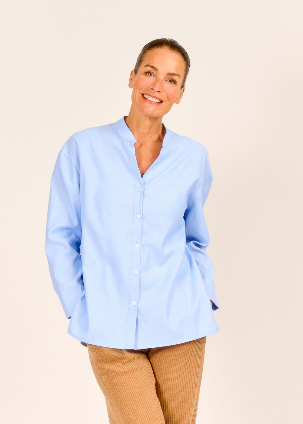 Frische deinen Kleiderschrank auf mit dieser lässigen Bluse in hellem Himmelblau. Der lockere, leicht verlängerte Schnitt umspielt die Figur und bietet maximalen Tragekomfort. Der dezente Stehkragen und die verdeckte Knopfleiste verleihen dem cleanen Design einen modernen und edlen Touch.