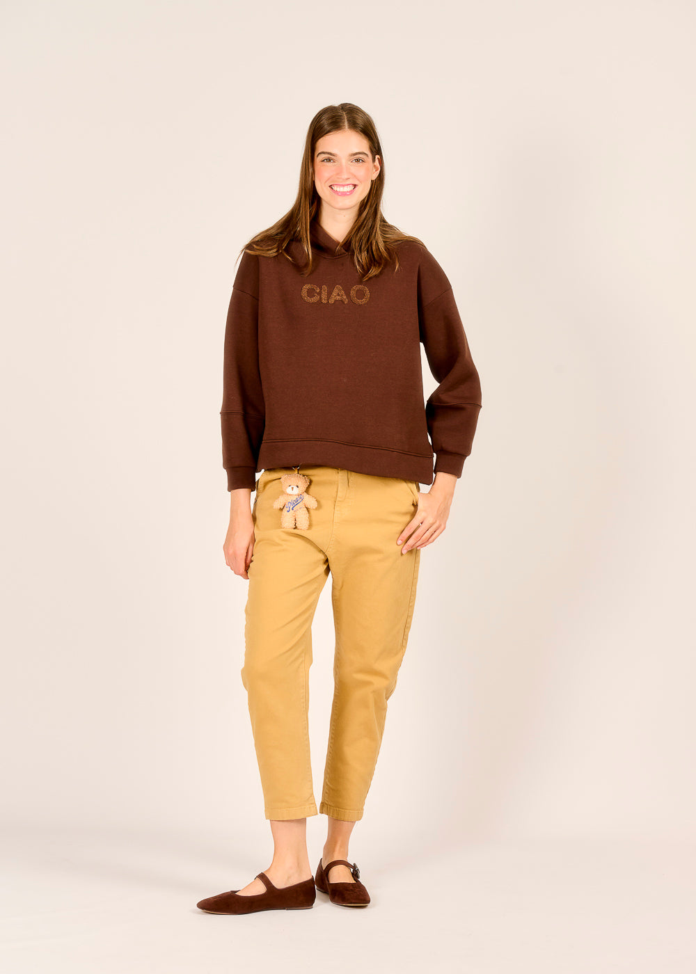Die Chino von PLEASE in der warmen Nuance caramello vereint lässigen Chic mit einem verspielten Detail. An der Vorderseite hängt ein kleiner Teddybär, der sich im Handumdrehen abnehmen und als stylischer Taschenanhänger nutzen lässt. Der bequeme Schnitt und die hochwertige Verarbeitung machen die Hose zum perfekten Allrounder für jeden Tag. So entsteht ein Look, der Individualität und Trendbewusstsein charmant verbindet.