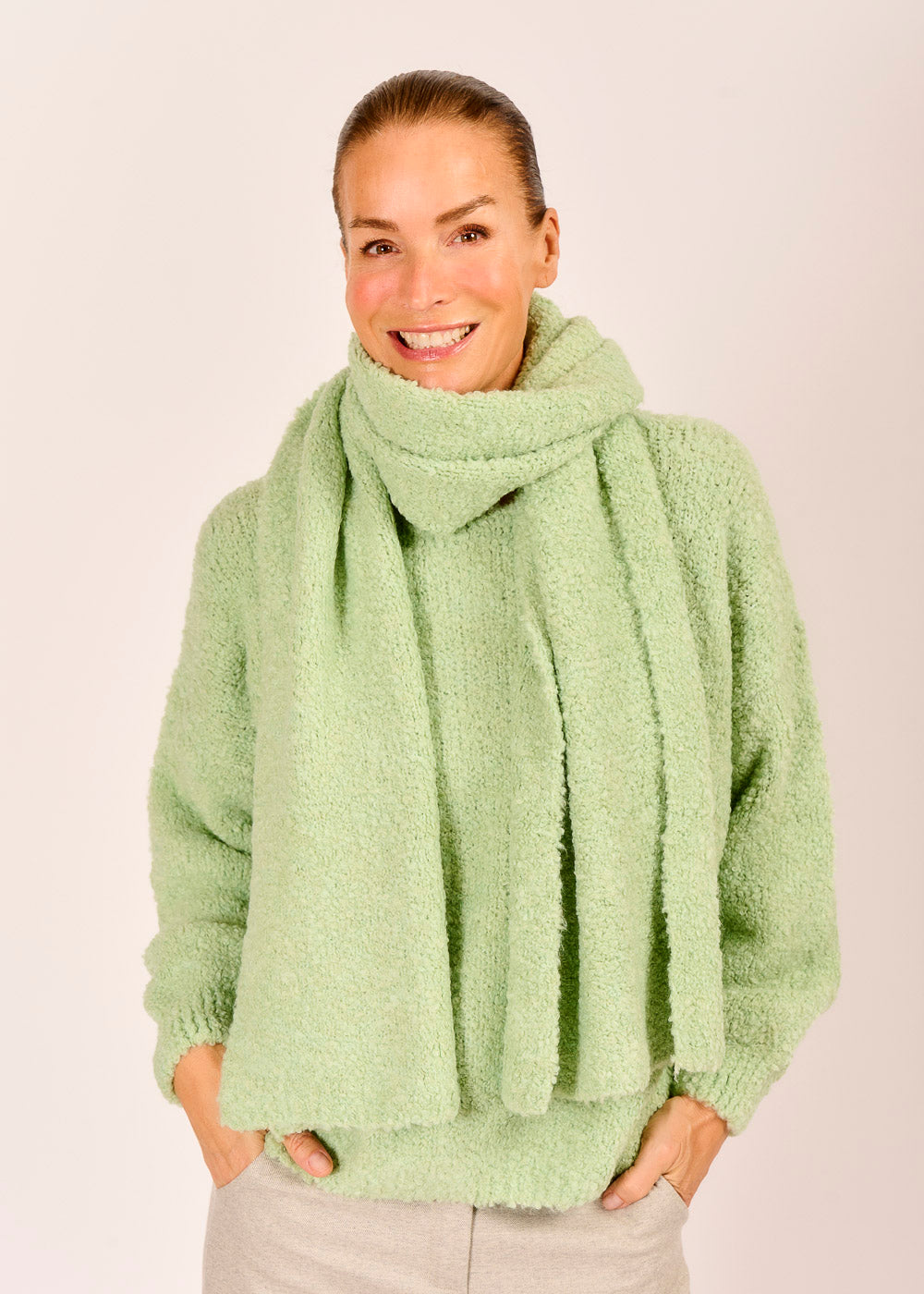 Dieser Bouclépullover in der zarten Farbe Salvia begeistert mit seiner kuscheligen Textur und lässigen Eleganz. Das weiche Material sorgt für ein angenehmes Tragegefühl und macht ihn zum perfekten Wohlfühl-Piece. Für den perfekten Look gibt es den passenden Schal dazu – ideal für stilvolle, harmonische Outfits.