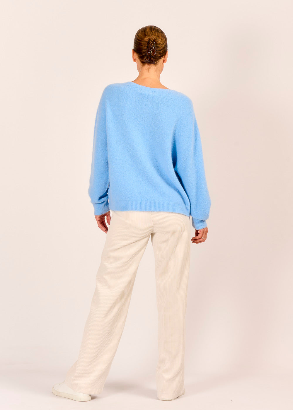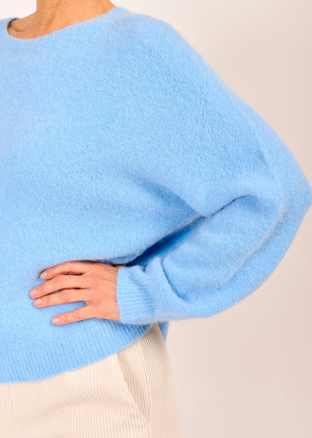 Kuscheliger trägt es sich nicht: Wie eine sanfte Umarmung umhüllt dich der hellblaue Wohlfühlpullover. Die frische Farbe lässt dich strahlen und der lockere Schnitt sorgt für einen lässigen Auftritt.