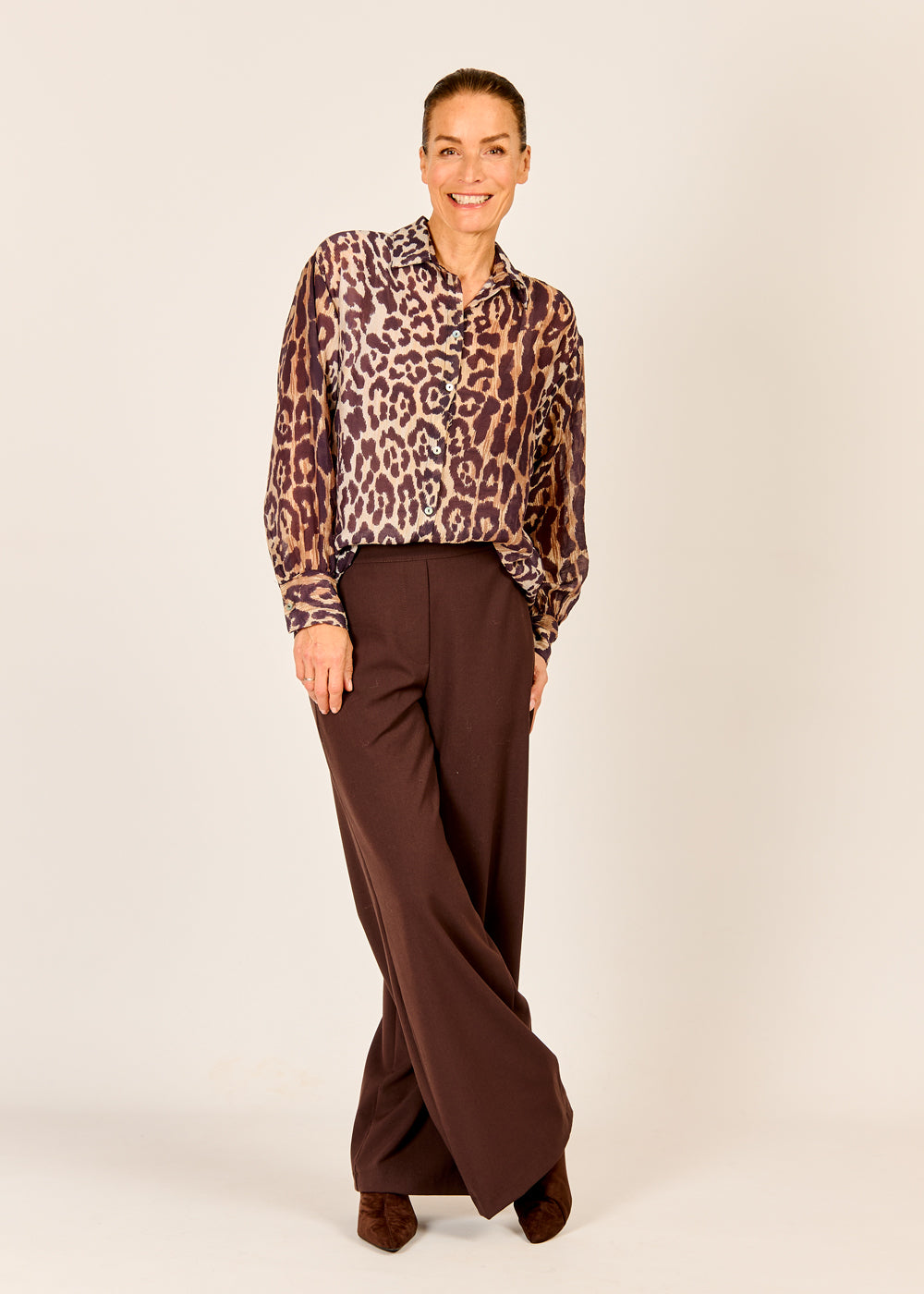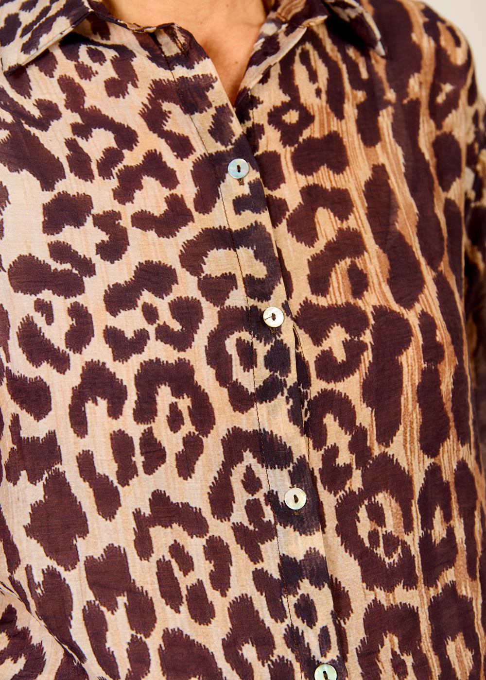 Diese exquisite Animal-Print-Bluse interpretiert das klassische Leopardenmuster neu mit einem luxuriösen, fließenden Material. Die warmen Braun- und Taupetöne des Prints verleihen der Bluse eine raffinierte Tiefe, die perfekt für elegante Anlässe ist. Mit ihrem zeitlosen Schnitt und dem Kragen ist sie sowohl schick für das Büro als auch ein glamouröses Statement für abendliche Events. Kombinieren Sie sie zu schlichten Hosen oder Röcken, um den Fokus auf dieses unwiderstehliche Trendstück zu lenken.